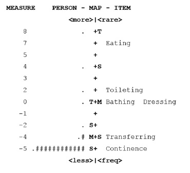 Resultados: Todos os itens foram ajustados ao modelo. A transferência e a continência mostraram um desempenho diferencial elevado do item com um impacto considerável (mas não estatisticamente significativo) na estimativa global. A confiabilidade para pessoa e item foi de 0,80 e 0,90, respectivamente. A medida de Rasch explicou 61,6% da variância.