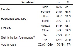 Field work was done by a group of surveyors, who were standardized in survey application, sampling, and information quality. The sampling was probabilistic by clusters, in two phases, and representative by subregion. The sample was calculated with Fleiss’ formula for finite populations, with a 95% confidence level, 5% sample error, 50% good health state proportion, and a design effect (deff) of 1.0, finally constituted by 4,248, with a 10% addition for possible losses.