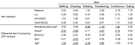Table 2 presents the measurements and standard errors for each item in logits. All items showed acceptable Infit MNSQ between 0.57 and 1.12. Items on1, 3 and 6 showed overfit according to Outfit MNSQ. There was no evidence of local dependency with standardized residual correlations below 0.09. Differential Item Functioning was detected in the items transferring and continence. For transferring difficulty was higher for rural, non-ill and under 70 older adults and for continence difficulty was higher for urban, ill and for over 70 older adults.