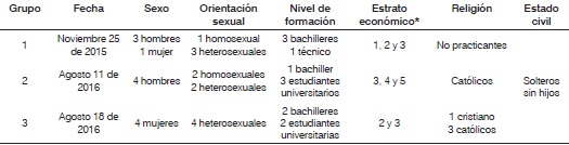 Un muestreo teórico permitió la saturación del discurso con tres grupos de discusión (véase Tabla 1]: el primero mixto, el segundo de hombres y el último de mujeres, todos moderados por una joven intérprete, parte del equipo de investigación, que por su edad y conocimiento en lengua de señas colombiana proporcionó un ambiente de confianza participante-moderador que favoreció la circulación del discurso. Los tres grupos de discusión se desarrollaron entre noviembre de 2015 y agosto de 2016, con la participación de 12 voluntarios sordos, entre los 18 y 29 años de edad, residentes locales, y quienes refirieron haber recibido educación formal.
