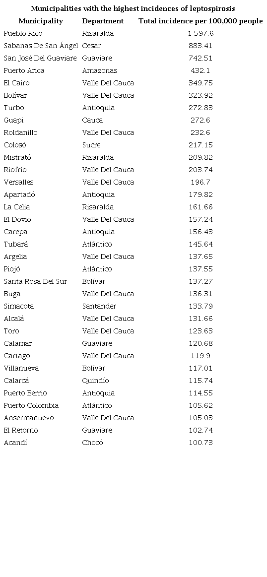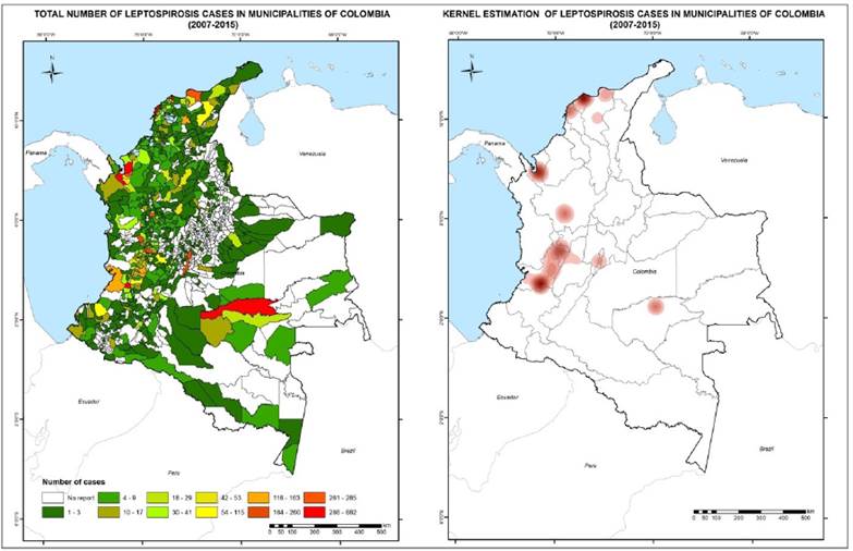 Conclusões: A leptospirose é distribuída em toda a Colômbia, com 85% dos casos concentrados em 10 dos 32 departamentos. Na escala municipal, há grande variação nas incidências anuais e foram identificados seis pontos quentes para os casos, indicando que existem área de alto risco para a doença.