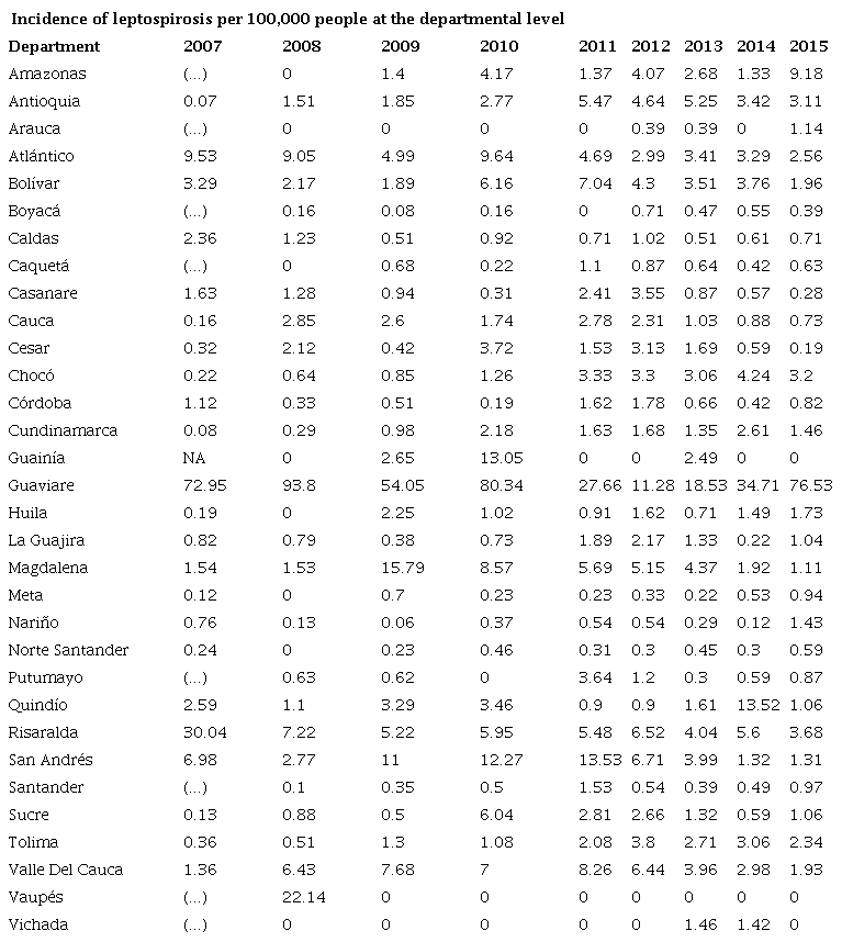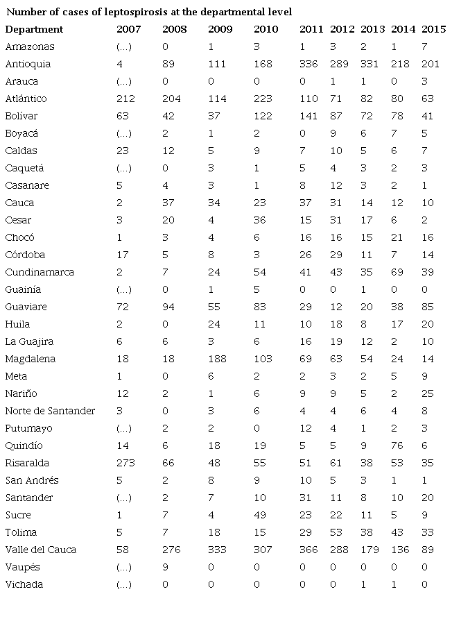 Objetivo: realizar uma análise epidemiológica da leptospirose humana na Colômbia em escalas nacionais, departamentais e municipais no período entre janeiro de 2007 e dezembro de 2015.