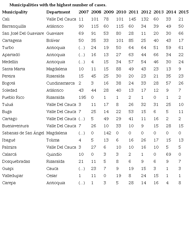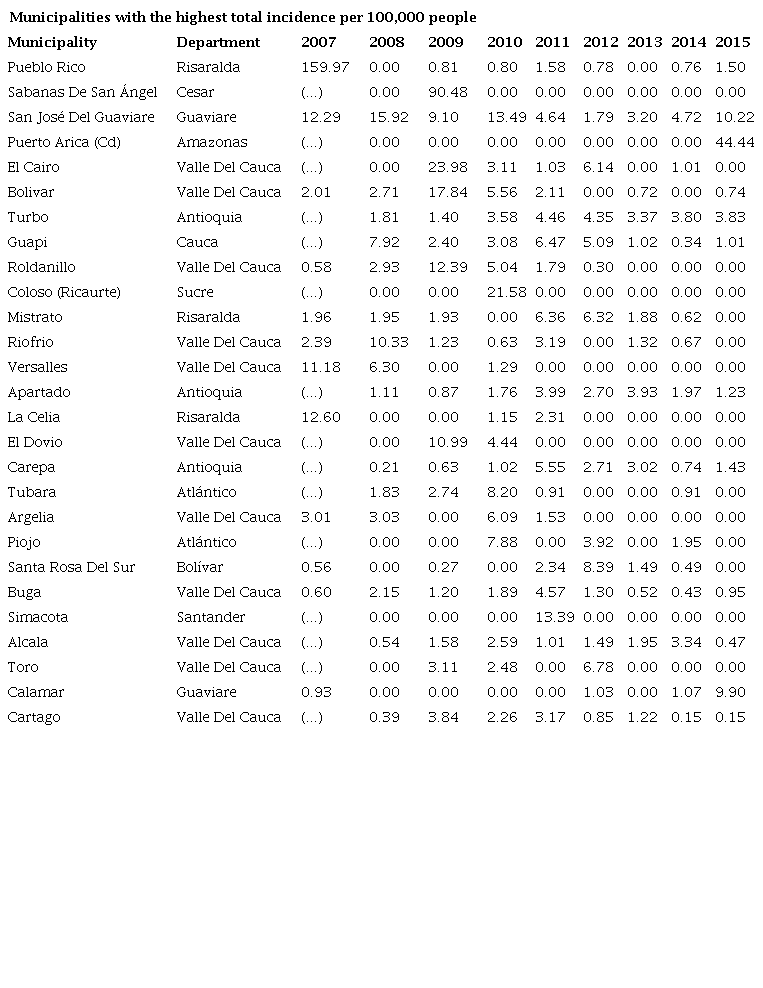 Resultados: se reportaron un total de 23 994 casos sospechosos, de los cuales se confirmó el 39,51%; el 82,4% proviene de zonas urbanas; el 68.87% se presentaron en hombres; la letalidad fue del 2,66% en los hombres y del 2,04% en las mujeres. Los departamentos con mayor número de casos fueron Valle del Cauca (n=2032), Antioquia (n=1 747), Atlántico (n=1159); la incidencia varió entre 2 (Arauca) y 465,4 (Guaviare) por 100 000 habitantes. A nivel municipal, Cali tiene el mayor número de casos (682), seguido de Barranquilla (n=612) y San José del Guaviare (n=448); la incidencia más alta fue 1 597.6 en Pueblo Rico (Risaralda), seguida por Sabanas de San Ángel (Magdalena) con 883.4 y San José del Guaviare (Guaviare) con 742.5; la mayoría de los municipios tuvieron incidencias entre 0 y 50 por 100 000 habitantes.