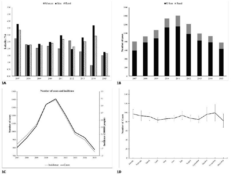 Methodology: A retrospective ecological study of the temporal trend and spatial distribution of leptospirosis cases reported between January 2007 and December 2015 was conducted. The variables of sex, age, municipality of residence, area of residence (urban, rural), date of onset of symptoms, and lethality were analyzed.