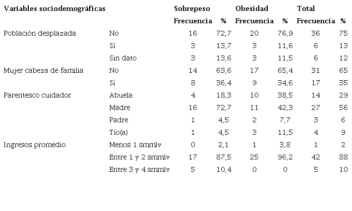 Uno de los cambios no previstos fueron las variaciones en el índice de masa corporal de las madres y cuidadores de los niños y las niñas. Este dato se obtuvo al evaluar los cuidadores participantes, quienes contaban con las mediciones del índice de masa corporal al inicio y al final de la intervención (véase Tabla 4]. En estos cuidadores se encontró que quienes fueron clasificados con obesidad y sobrepeso se caracterizaban por residir en el estrato 2, y los clasificados con obesidad mórbida se caracterizaron por ser de estrato 3 y tener ingresos promedio mensuales de 1 a 2 smmlv.