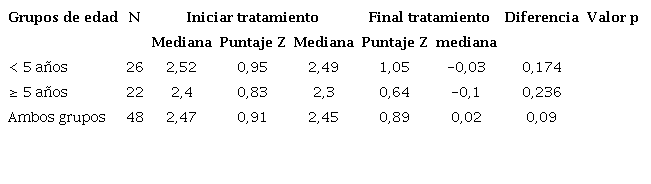 De este modo, con estos 48 niños y niñas profundizamos el análisis de la intervención y se evaluaron los efectos de la intervención mediante indicadores antropométricos. Los participantes se diferenciaron de acuerdo con las actividades recibidas, a fin de determinar las variaciones en el p/t de los niños y las niñas menores de 5 años, y del imc de los mayores de 5 años.