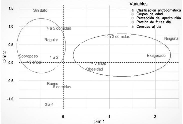 Al analizar las características relacionadas con la alimentación, se encontró que los cuidadores consideran el apetito como exagerado en los niños y las niñas clasificados como obesos; de igual forma, estos niños se caracterizan por comer entre 2 y 3 comidas al día y no consumen frutas.