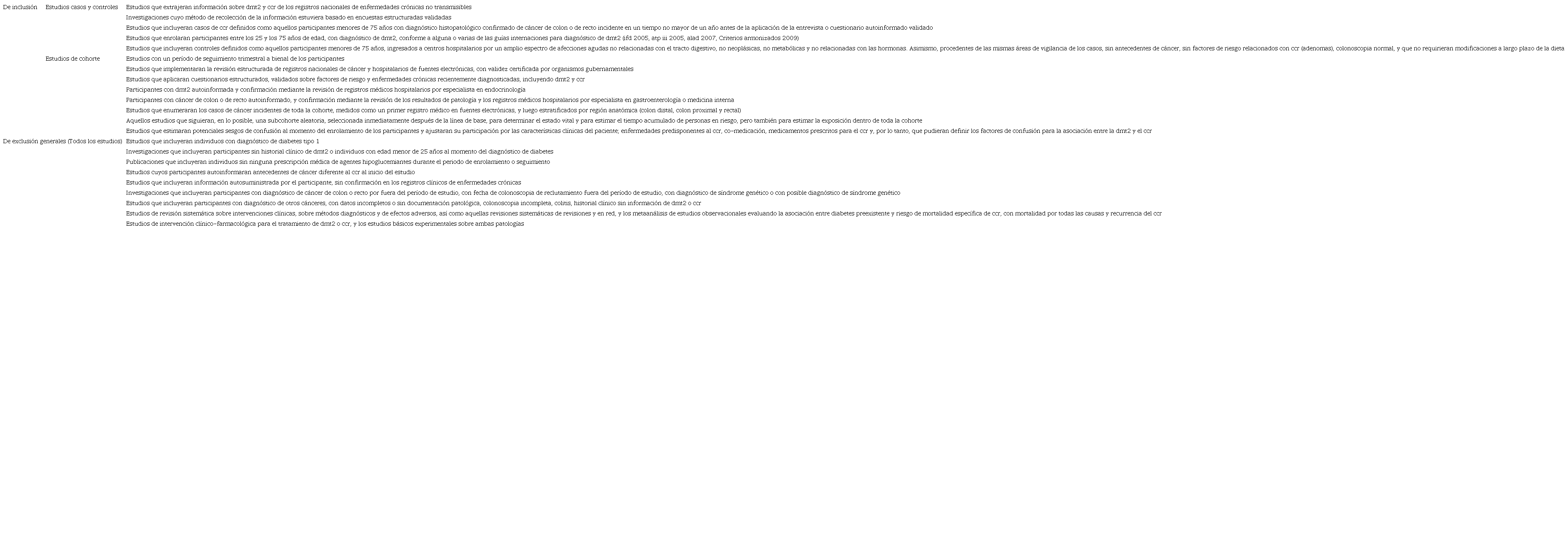 Se incluyeron estudios de investigación original tipo casos y controles, estudios de cohorte prospectiva, cohorte retrospectiva, retrospectivos con enfoque de casos y controles, retrospectivos con enfoque casos-cohorte, que evaluaron el riesgo de desarrollar cáncer de colon o de recto en adultos de ambos sexos con diagnóstico de dmt2, a nivel mundial.