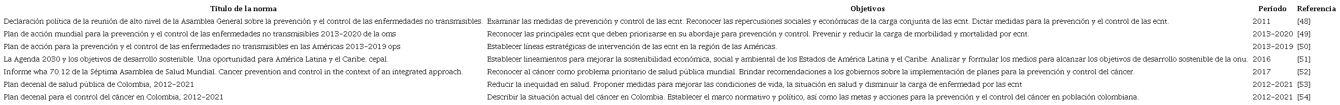 Las normativas en salud pública internacionales y colombiana para poner en marcha medidas concertadas de lucha contra la diabetes, el cáncer y otras ecnt (véase Tabla 3], convergen en sus objetivos de reducir la mortalidad prevenible asociadas a ecnt, así como disminuir al mínimo la exposición a factores de riesgo comunes, aumentar la exposición a factores protectores y mitigar la carga socio-económica de estas enfermedades.