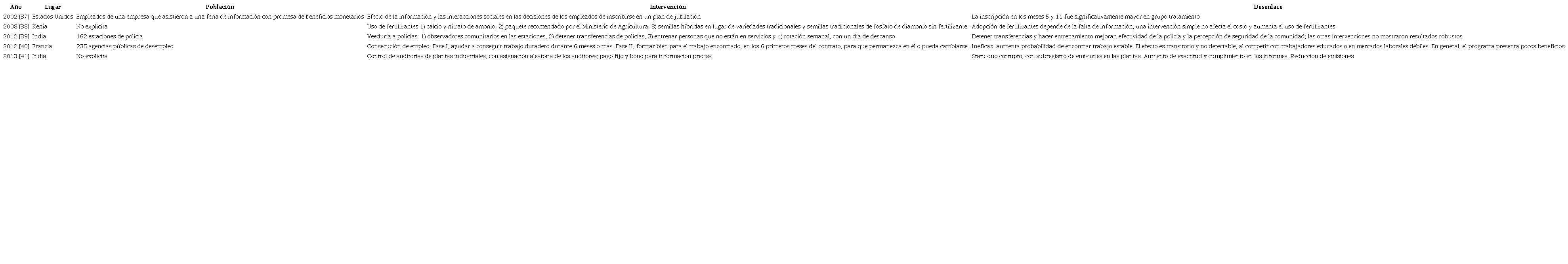 Resultados: Se analizaron 34 evaluaciones aleatorias de programas sociales contra la pobreza, el 41,2 % en educación; el 20,6 % en salud; el 8,8 % sobre microcréditos; el 8,8 % en participación política de las mujeres y el 5,9 % en transferencias directas a poblaciones pobres. Las restantes evaluaron el uso de fertilizantes, veedurías a policías, consecución de empleo y control a las emisiones ambientales en plantas industriales.