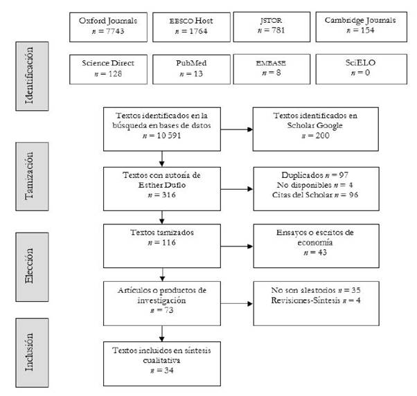 En la búsqueda inicial de identificaron 10 791 manuscritos, de los cuales 316 tenían la autoría de Esther Duflo. Posterior a la aplicación de los criterios de inclusión y exclusión, resultaron 34 estudios para la síntesis cualitativa (véase Figura 1]. Entre los estudios analizados, 16 se realizaron en India, 10 en Kenia, 4 en Marruecos, 1 en Sudáfrica, 1 en Francia, 1 en Estados Unidos y 1 multicéntrico en 7 países.