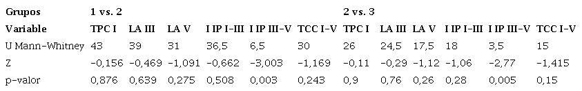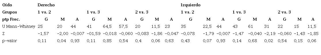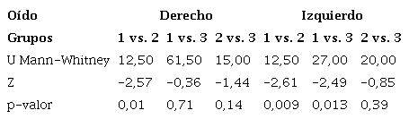 Resultados: El oído derecho presentó diferencias significativas en las frecuencias medias y discriminación de la palabra en G1 vs. G2 (p = 0,045 y 0,010, respectivamente). El oído izquierdo mostró diferencias significativas en las frecuencias agudas en G1 vs. G3, en las latencias interpeakde las ondas iii-v (tiempo en milisegundo transcurrido entre la onda iii y v posterior al estímulo) en G1 vs. G2 (p = 0,003) y G2 vs. G3 (p = 0,005) a 80 dB; en las latencias interpeaki-iiiy iii-v en G1 vs. G2 (p = 0,039) a 60 dB y en la discriminación de la palabra en G1 vs. G2 (p = 0,009) y G1 vs. G3 (p = 0,013).