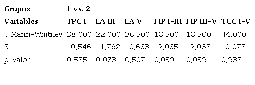 En la Tabla 4 se muestran las diferencias de los peatc del oído izquierdo a 60 dB entre los grupos de abstemias y consumo moderado de alcohol, comprobándose que existen diferencias significativas en las variables de latencia interpeak de las ondas i-iii y iii-v, ambas con un p= 0,39.