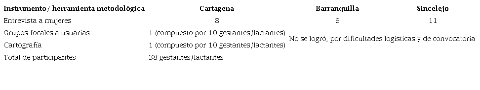 Para el desarrollo de esta investigación, se seleccionaron madres gestantes y lactantes atendidas en el Camino Bosque de María, en Barranquilla; la Clínica General del Caribe, en Cartagena, y la ips San Luis, en Sincelejo.