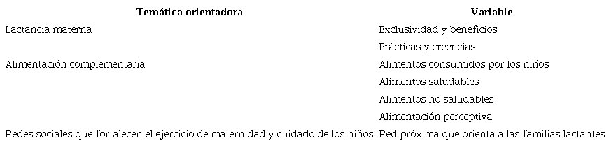 En cuanto a las variables propuestas, se enmarcaron en la práctica de la lactancia materna, la alimentación complementaria y las redes sociales que fortalecen el ejercicio de maternidad y cuidado de los niños (véase Tabla 2].