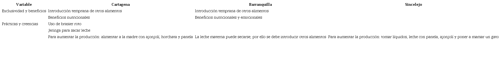 Frente a los beneficios de la leche materna, en Cartagena, la mayoría de las mujeres reconoce aquellos relacionados con el aporte nutricional, mientras que, en Barranquilla y Sincelejo, además mencionaron los beneficios de vínculo entre madre e hijo, quienes refirieron haber adquirido estos conocimientos en la institución de salud, y especialmente donde les atendieron el parto.