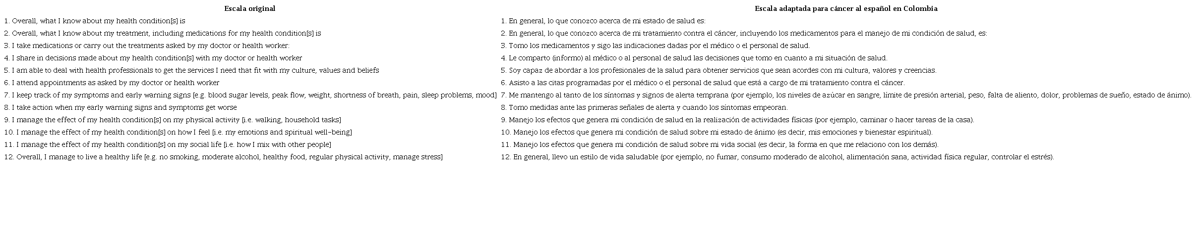 Los ítems se redactaron con la afirmación en primera persona del singular, a fin de lograr, en la medida de las posibilidades, que sea el adulto quien diligencie y haga el autochequeo de sus comportamientos de automanejo. En la aplicación a 30 adultos con cáncer, la escala mostró alta comprensibilidad para los 12 ítems (100 %). La Tabla 1 muestra la versión original y la adaptada al español colombiano.