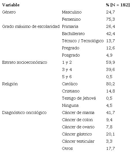 El estudio se adelantó en la Clínica Oncológica San Diego, en Bogotá, Colombia. Las personas que asisten a esta institución reciben algún tratamiento oncológico contra el cáncer. Se consideraron como criterios de inclusión: 1) mayores de 18 años, 2) con diagnóstico de cáncer, 3) en tratamiento oncológico con intención curativa y 4) con estado mental intacto. Se excluyeron pacientes en estado terminal o con deterioro cognitivo (determinado por el médico tratante).