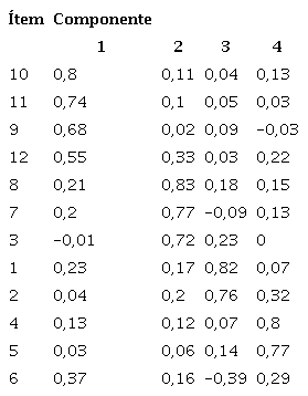 Después de examinar los estadísticos descriptivos de los ítems, estos se incluyeron en el análisis factorial exploratorio. El índice de Kaisser-Meyer-Oilin de suficiencia fue de 0,74, indicando que el análisis de correspondencias era adecuado para los datos. De manera similar, el test Barlett de esfericidad arrojó un resultado estadísticamente significativo (χ2 [66] = 511,69, p< 0,000), lo que indica la existencia de correlaciones adecuadas entre los ítems, y que era pertinente proceder con el análisis.