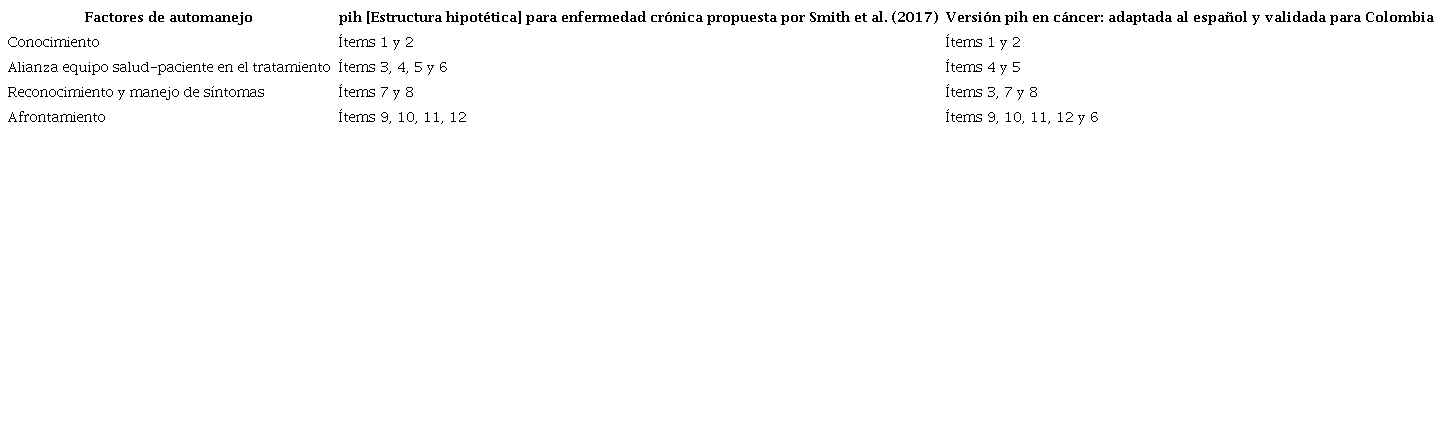 Conclusions: The pih scale adapted to Spanish comprehensively evaluates the self-management behaviours of a person with cancer, demonstrated construct validity and internal consistency for use in the Colombian context