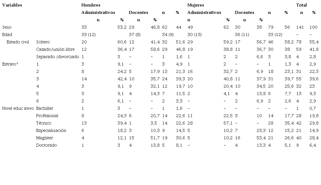 Se encontró que el 58,2 % de los empleados eran administrativos (n = 82) y el 41,8 % (n = 59) docentes.