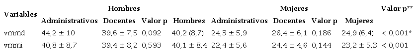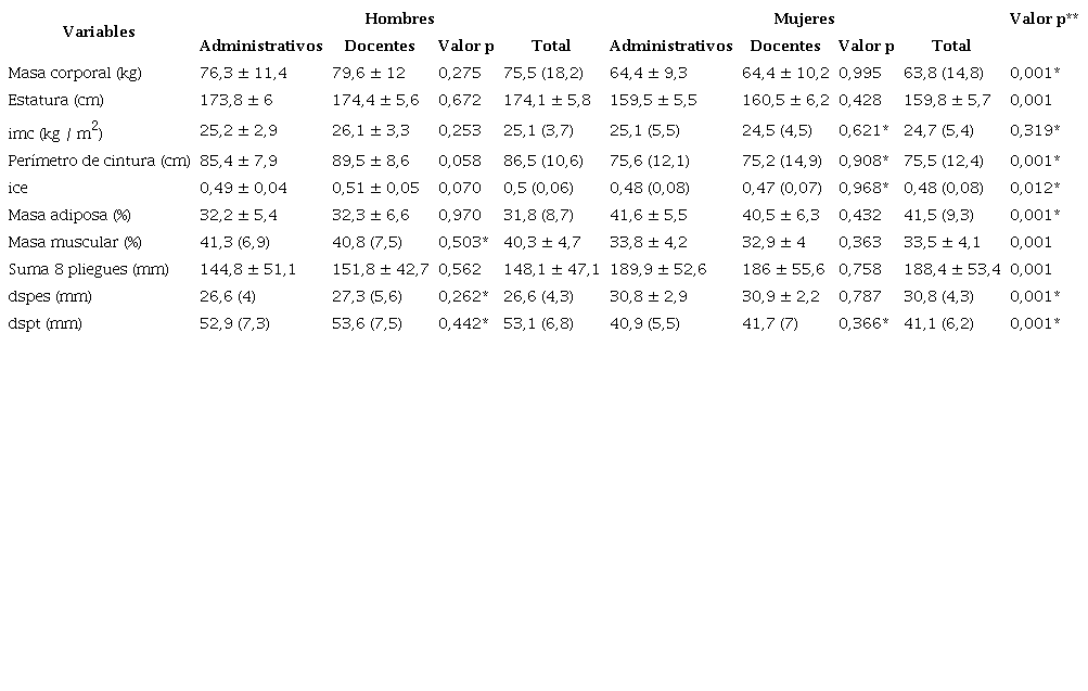 No se presentaron diferencias estadísticamente significativas según el cargo, pero sí se hallaron diferencias por sexo en todas las variables (p < 0,001), a excepción del índice de masa corporal (imc) (p = 0,319).
