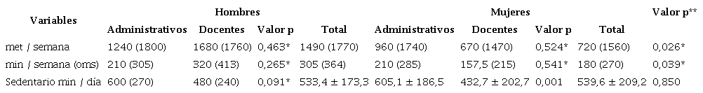 Paralelamente, se encontró que la población de estudio presenta un alto comportamiento sedentario (85,8 %), siendo menor esta conducta en los docentes de ambos sexos, en comparación con los administrativos; sin embargo, sobrepasan las 6 horas / día sentados o recostados (véase Tabla 3].