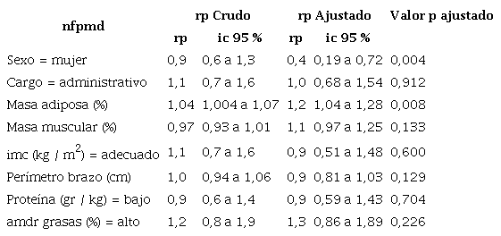 Se aplicó regresión multivariada como método exploratorio para evaluar la influencia de aspectos sociodemográficos, de perfil nutricional y de actividad física con el nivel de fp de mano dominante, por medio de un modelo lineal generalizado de regresión de Poisson, con varianza robusta para ajustar la rp y sus ic de 95 % por múltiples variables.