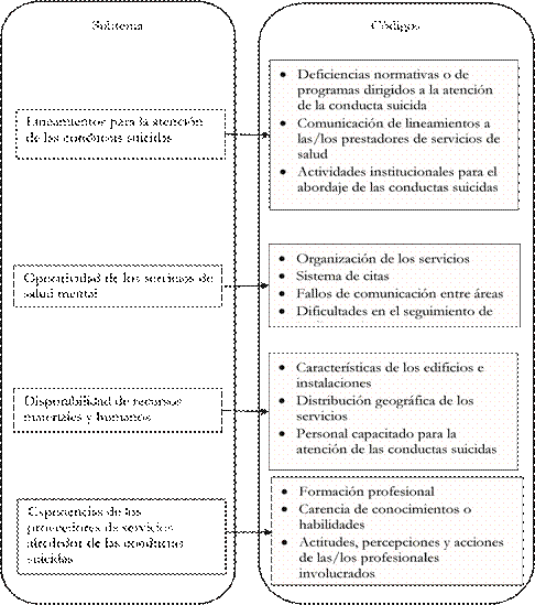Resultados: Las/los participantes consideraron que las conductas suicidas no han sido definidas como una prioridad dentro de los trastornos de salud mental. La ausencia de políticas públicas, la sobrecarga de trabajo, la falta de seguimiento a las/los pacientes, entre otras, fueron identificadas como barreras para una atención adecuada y oportuna.