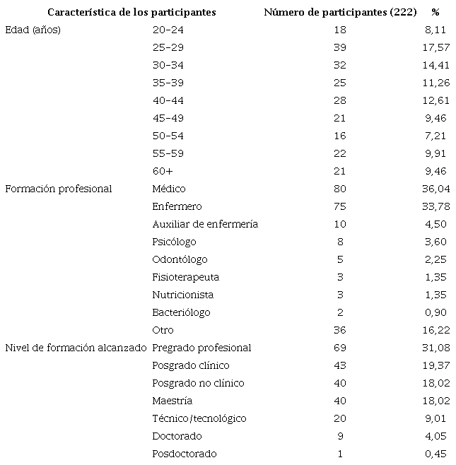 Por su parte, la población objetivo estuvo compuesta por 222 personas, quienes evaluaron el video y diligenciaron el instrumento. Fueron 140 mujeres (63,06 %) y 82 hombres (36,94 %), con edades entre 20 y 63 años, promedio de 40 años, la mayoría entre 25 y 29 años (17,57 %). Su formación era así: 80 médicos (36,04 %), 75 enfermeros (33,78 %) y 67 eran otros profesionales y técnicos del área de la salud (30,18 %), incluyendo dos doulas; 69 participantes (31,08 %) contaban con formación de pregrado, y 43, con posgrado clínico (19,37 %). Una persona tenía posdoctorado.