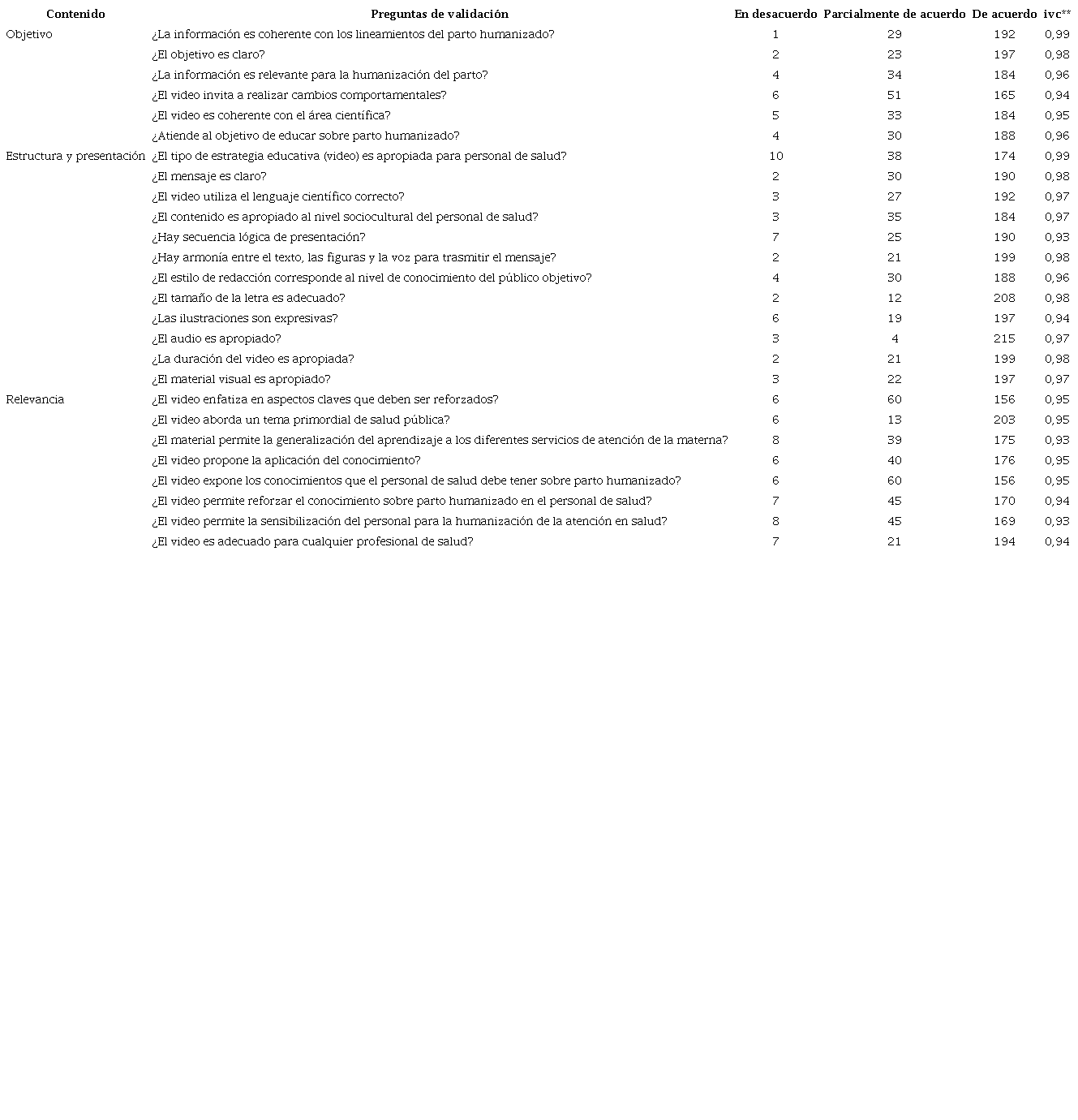 La población objetivo calificó las tres secciones del video con un ivc que osciló entre 0,92 y 0,99, con una concordancia media de 97,87 % (κ entre 96,40 y 99,55 %). La pregunta con más profesionales en desacuerdo fue si el tipo de estrategia educativa (video) es apropiada para personal de salud [n= 10 (4,50 %)], seguida de si el video permite la sensibilización del personal para la humanización de la atención en salud [n= 8 (3,60 %)], y si el material permite la generalización del aprendizaje a los diferentes servicios de atención de la materna [n= 8 (3,60 %). Sin embargo, estos desacuerdos corresponden a menos del 5 % y no son estadísticamente significativos.