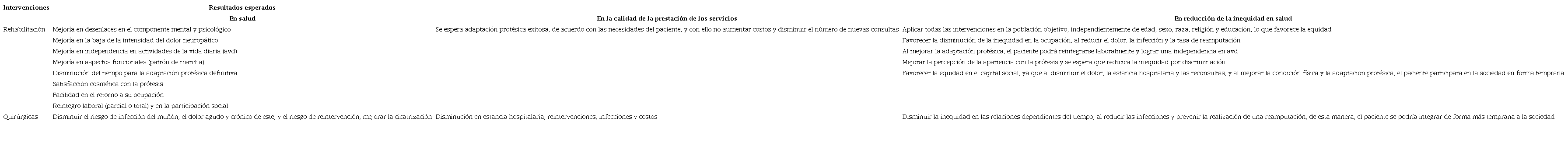 A las intervenciones quirúrgicas y de rehabilitación se les definieron los resultados esperados en salud, en la calidad de la prestación de servicios y en la disminución de inequidad en salud (véanse Tabla 1 y Anexo 2).