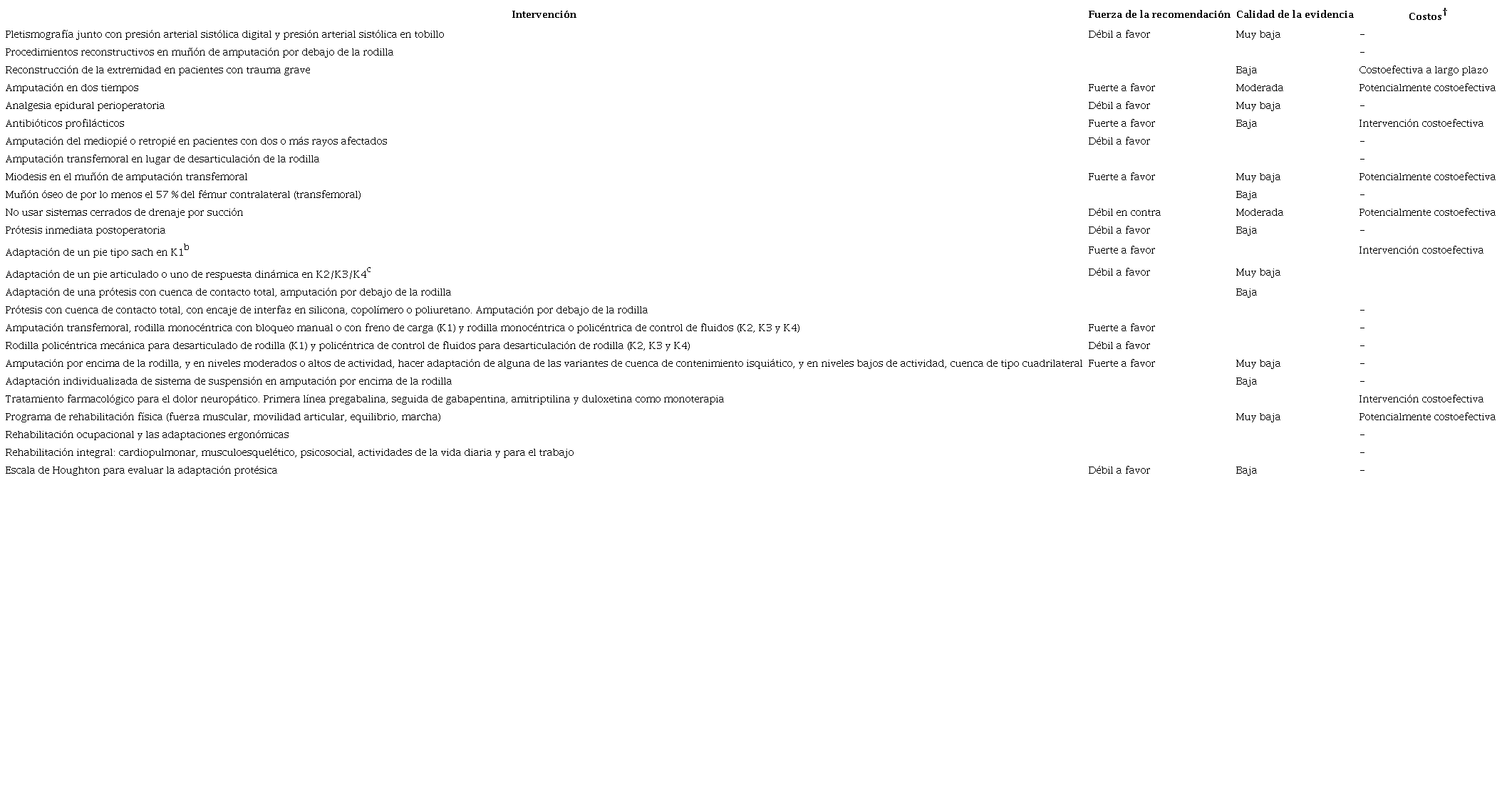 Seis de las recomendaciones cuentan con análisis de costoefectividad, como, por ejemplo, la reconstrucción de la extremidad en pacientes con trauma grave. La fuerza de la recomendación fue fuerte a favor en 12 de ellas, débil a favor en otras 12 y débil en contra en 1 recomendación; la calidad de la evidencia está entre muy baja y moderada.