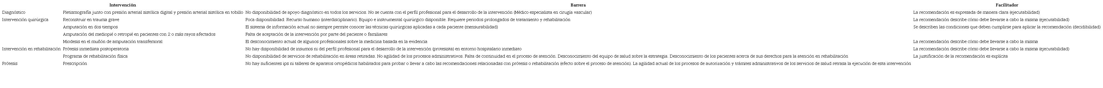 Las barreras y los facilitadores identificados con mayor frecuencia para las intervenciones individuales en el ámbito asistencial, tanto en el entorno hospitalario como ambulatorio, fueron las siguientes: falta de apoyos diagnósticos, de equipo e instrumental quirúrgico disponible; falta de recurso humano en los servicios según la complejidad; poca disponibilidad de servicios de rehabilitación en áreas lejanas; insuficientes ips habilitadas para llevar a cabo recomendaciones relacionadas con prótesis o rehabilitación; falta de adherencia a las gpc por parte de los profesionales de la salud, y falta de continuidad en el proceso de atención. Esta última barrera ha sido identificada por muchos actores como la más importante para obtener los logros planteados tanto en la gpc como en esta rias (véase Tabla 4).
