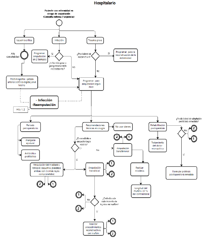 Objective: Build an Integral Health Care Pathway for the care of patients with lower limb amputation due to traumatic, vascular or diabetes mellitus causes, in order to implement the recommendations of the cpg for amputee patients and guarantee comprehensive health care for this population in Colombia.