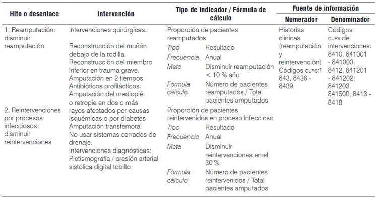 A partir de las recomendaciones definidas y agrupadas en las diferentes categorías, se formularon y caracterizaron los resultados que se esperan en el proceso de gestión y atención del paciente amputado, con el fin de garantizar su integralidad. Dichos resultados se determinaron como hitos de la atención y fueron: reamputación, reintervenciones por procesos infecciosos, adaptación protésica, reintegro laboral e independencia en actividades de la vida diaria. Se formularon los hitos o desenlaces, las intervenciones (recomendaciones) relacionadas con cada uno de ellos, el tipo y la fórmula de cálculo de los indicadores, y las fuentes de información. Para su formulación se tuvieron en cuenta la facilidad para ser medidos por medio de indicadores y las fuentes disponibles en los sistemas de información, como la historia clínica (véase Tabla 3).