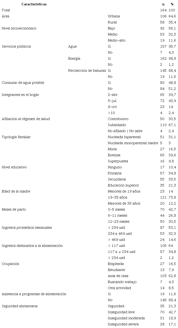 La edad media de las madres fue de 26,1 años (ds = 7,0) y el 14 % tenía menos de 19 años; el 56,1 % pertenecía al nivel socioeconómico más bajo; el 64,6 % vivía en área urbana; el 48,8 % contaba con agua potable para el consumo y el 54,8 % tenía estudios de secundaria o superiores. En relación con el ingreso mensual promedio del hogar, el 53,1 % recibió menos de 234 usd y el 64 % destinó menos de 117 usd para alimentos, teniendo en cuenta que cerca de 44 % de los hogares se encontraban conformados por entre 5 y 7 personas. Eran amas de casa (62,8 %), tenían empleo (16,5 %) y asistían a programas de alimentación (11,6 %). La inseguridad alimentaria (insan) afectó el 78,7 % de los hogares (véase Tabla 1].