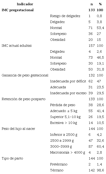 De las madres lactantes, el 28,6 % presentó, al momento de la evaluación, un peso inferior a su peso pregestacional, y el 30 %, una retención de peso superior a 5 kg (véase Tabla 2].