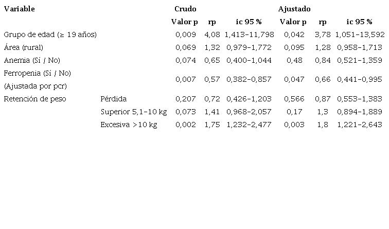 Se aplicó regresión multivariada como método exploratorio para evaluar el efecto de los aspectos sociodemográficos, antropométricos y los biomarcadores del estado nutritivo del hierro en el exceso de peso y la anemia de las mujeres lactantes, por medio de un modelo lineal generalizado de regresión de Poisson, con varianza robusta, para ajustar la razón de prevalencias (rp) y sus ic 95 % por múltiples variables. Un valor p< 0,05 se consideró estadísticamente significativo.