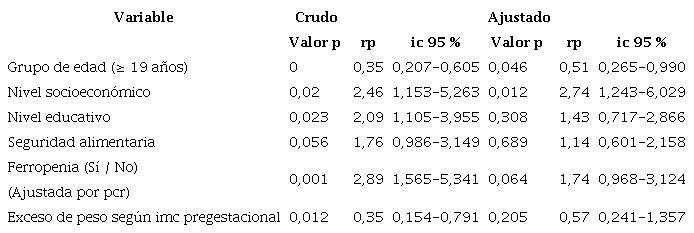 Al ajustar por el modelo de regresión multivariado los factores asociados al exceso de peso, se halló asociación positiva con el grupo de edad y la retención de peso posparto excesiva, lo cual explica que las mujeres mayores de 19 años y la retención de peso > 10 kg son factores de riesgo (véase Tabla 3]; mientras que la ferritina presentó asociación negativa con este aspecto. Por otro lado, al evaluar los factores de riesgo asociados a la anemia, se encontró asociación positiva con el bajo nivel socioeconómico, y asociación negativa respecto al grupo de edad en las mayores de 19 años (véase Tabla 4].