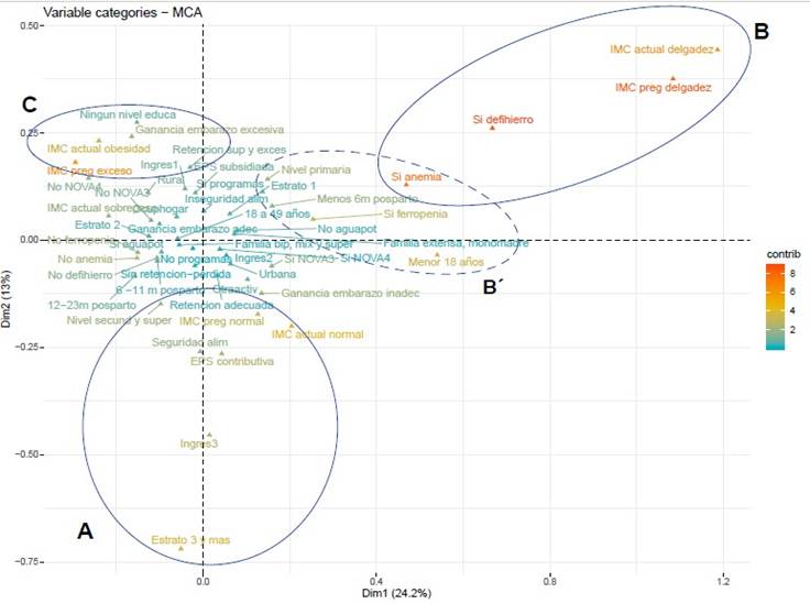 El acm permitió identificar tres grupos: el primero (A), caracterizado por mejores condiciones socioeconómicas y nutricionales, permite visibilizar cómo estas condiciones pueden comportarse como factores de protección en una población, e influenciar su estado nutricional. Situación similar reportó un estudio en Estados Unidos [21], en el que las madres lactantes que tuvieron mejor nivel educativo y socioeconómico, presentaron mejores condiciones de salud.