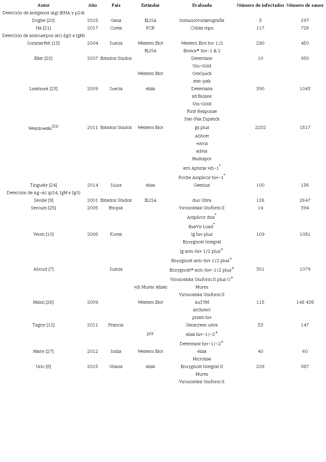 Inclusión: todos los artículos que cumplieron con la fase anterior fueron leídos y valorados para la extracción de las siguientes variables: título, autor, año de publicación, lugar del estudio, tamaño de muestra, tipo de prueba de tamización, estándar o prueba de referencia, verdaderos positivos (donantes vih con resultado positivo en la tamización) y verdaderos negativos (donantes sin vih con resultado negativo en la prueba de tamización), falsos positivos (donantes sin la infección, con resultado positivo en la prueba de tamización) y falsos negativos (donantes con la infección, con resultado negativo en la prueba de tamización).