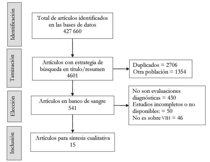 Tamización: se incluyeron las publicaciones con los términos de búsqueda en título o resumen, se eliminaron todos los estudios duplicados y se incluyeron aquellos que analizaron los parámetros de evaluación diagnóstica, que la evaluación fuese para vih, realizados a partir del año 2000 y cuya población objeto de estudio estuviera constituida por donantes de sangre.