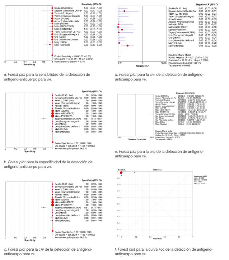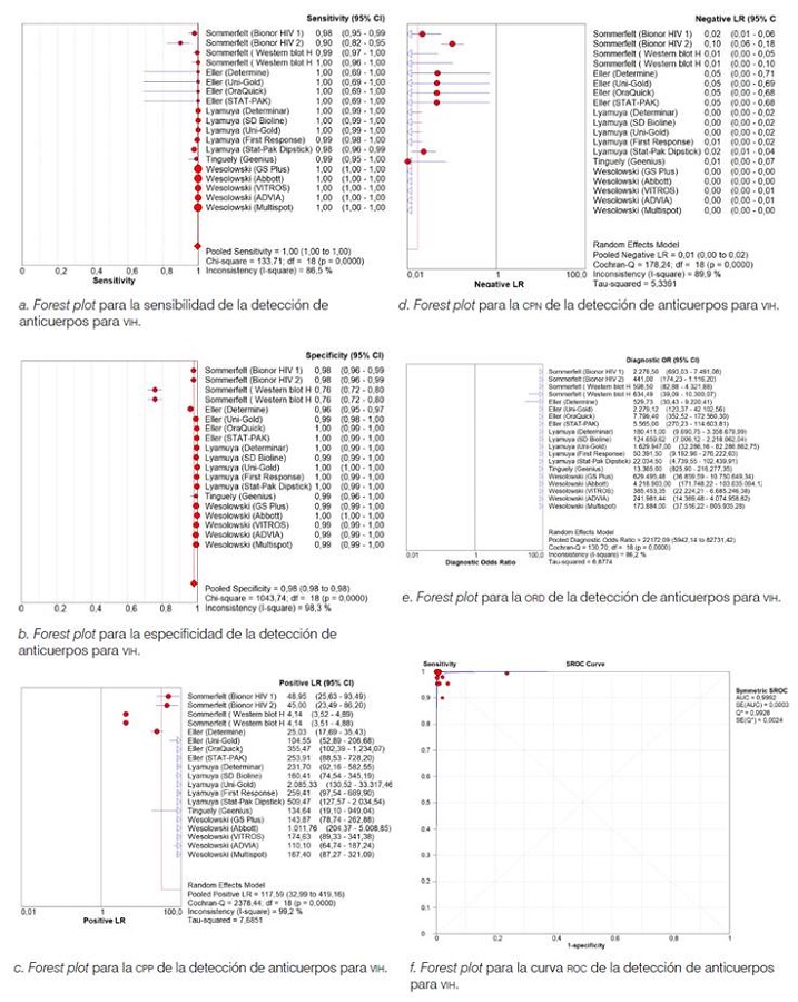 Para los estudios de detección de anticuerpos y los ensayos de cuarta generación, se llevó a cabo un metaanálisis de efectos aleatorios (dada la alta heterogeneidad estadística), para los parámetros de sensibilidad, especificidad, cociente de probabilidad positivo (cpp) y negativo (cpn), razón de odds diagnóstica (ord) y curva roc, con sus intervalos de confianza del 95 %.