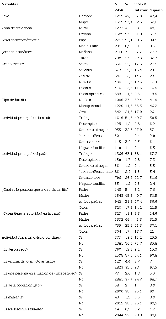 El 57,0 % de los estudiantes provenía de la zona urbana del municipio, y en su gran mayoría, sus familias estaban clasificadas en el nivel socioeconómico bajo (estratos 1 y 2); la edad promedio de los participantes fue de 14,6 ± 1,8 años, con predominio de las mujeres, con el 57,4 %; el número de familiares promedio con los que convivían los estudiantes fue de 4,7 ± 1,9 miembros (véase Tabla 1].