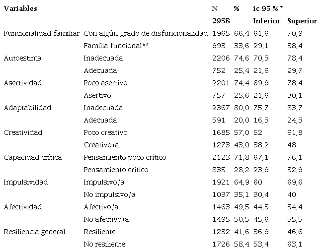 Methodology: This is a cross-sectional study with twostage stratified probability sampling on a sample of 2,958 schoolchildren to whom the JJ46 questionnaire was administered. We calculated the prevalence of non-resilience and related it to the selected factors using 95% confidence intervals. Moreover, we constructed a binomial regression for non-resilience while controlling the independent variables that could potentially misidentify the relationship with the outcome.