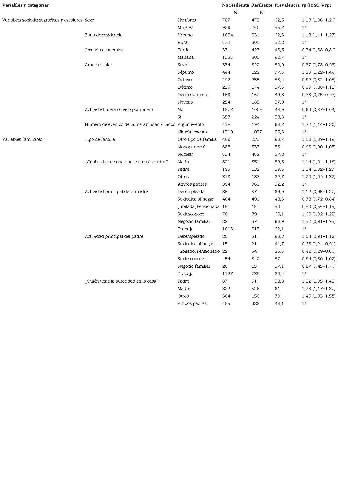 Resultados: Se encontró una prevalencia de no resiliencia del 58,4 %, siendo mayor en los hombres, de la zona urbana, que cursaban grado séptimo y que habían vivido algún evento vulnerable, en el 22,0, 29,0, 73,0 y 40,0 % respectivamente, con respecto a las mujeres, de la zona rural, que estaban en grado noveno y que no habían vivido eventos vulnerables. La prevalencia de no resiliencia en los hombres excedió en un 20 % el de las mujeres; y con respecto a la persona que le daba más cariño al escolar, en el 88 % de los casos eran otros familiares distintos a ambos padres.