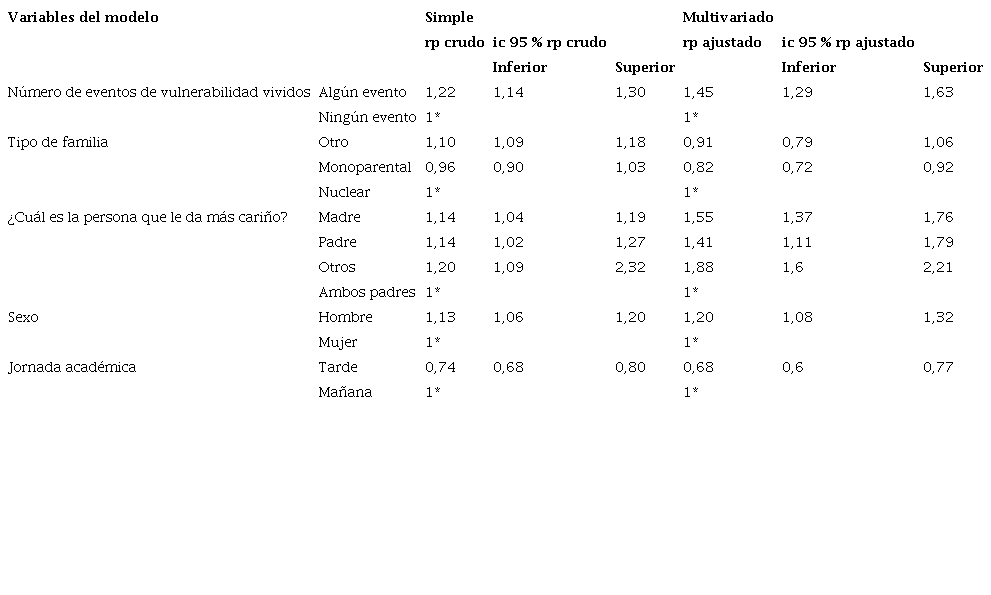 Los factores que aumentan la oportunidad de no resiliencia son el número de eventos de vulnerabilidad vividos, pertenencia a una familia nuclear, afectividad diferencial de los padres, ser hombre y estar en la jornada de la mañana.