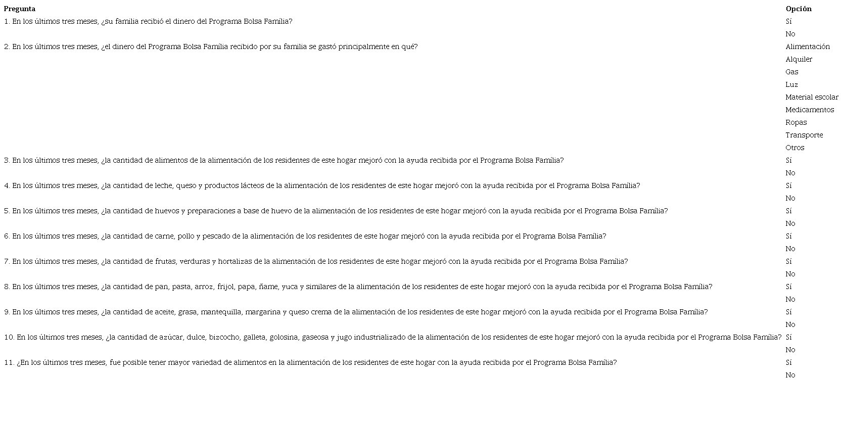 A continuación se preguntó a las madres sobre la recepción del beneficio del pbf, el uso del dinero recibido y posibles cambios en la alimentación de la familia con la ayuda recibida, en los últimos tres meses antes de la aplicación del cuestionario. Las preguntas fueron elaboradas por el coordinador de la investigación con base en el padrón de la ebia, discutidas, revisadas y aprobadas por el equipo que participó en la colecta de datos (véase Tabla 1].
