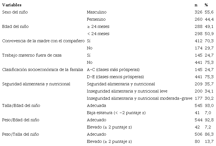 Un total de 586 madres/niños participaron en el estudio, de los cuales el 55,6 % eran varones y el 49,1 % tenían 24 meses o más. Hubo un predominio de madres que no trabajaban fuera del hogar y familias de la clasificación socioeconómica D-E, representando el 75,3 % de la muestra. Las prevalencias de los problemas de interés fueron 30,2 % de ianm-g, 7,0 % de talla baja, 7,2 % de p/e alto y 13,7 % de p/t alto (véase Tabla 2].